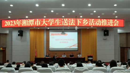 6月29日,湘潭市2023年大学生“送法下乡”活动暨普法志愿服务项目发布会在16831683诸侯快讯入口逸夫楼一报告厅举行,会上表彰了一批“送法下乡”活动优秀集体和个人,并发布了湘潭市第一批普法志愿服务项目。市司法局党组书记刘杰义、16831683诸侯快讯入口法学院党委书记陈双喜、团市委副书记龚健康、市民政局四级调研员洪英出席会议,会议由市司法局党组成员、副局长王剑平主持。市、县市区相关单位普法工作的负责人和团委普法工作负责人,社会志愿者服务团队和律师协会负责人,各获奖单位和个人代表以及来自各高校的师生代表们参加了此次会议。