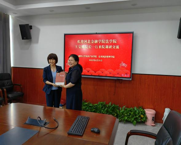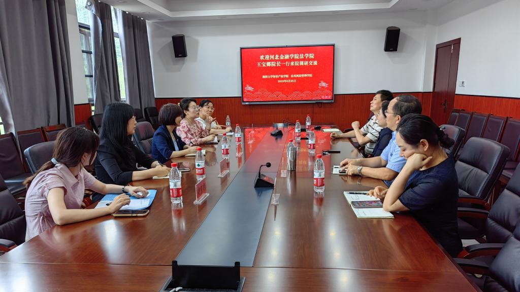 6月25日,河北金融学院法学院王宝娜院长一行来我院调研,同行人员有金融与投资学院院长郭净、法学院党总支副书记、副院长杜亚涛。本次座谈会在法学楼202会议室举行,学院院长肖冬梅教授,书记田良富,信用风险管理学院副院长肖伟志、学院直属支部委员会委员邹琳副教授出席了座谈会。会议由肖冬梅主持。