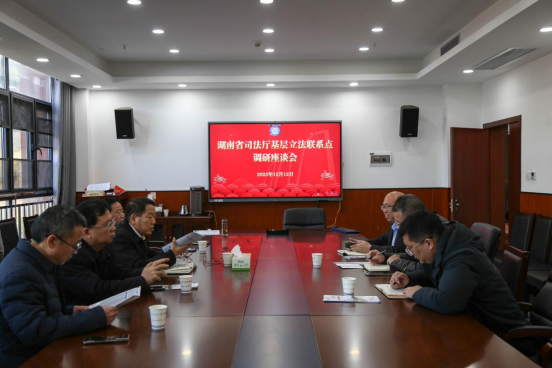 2023年12月12日上午,湖南省司法厅二级巡视员田自成、省司法厅立法一处处长彭荣卫、法律职业资格管理与对外合作交流处处长刘刚魁、法律职业资格管理与对外合作交流处一级主任科员彭梦溪等一行4人来我院开展调研。法学院党委书记陈双喜主持座谈会,连光阳副院长、李云霖教授参加了座谈会。