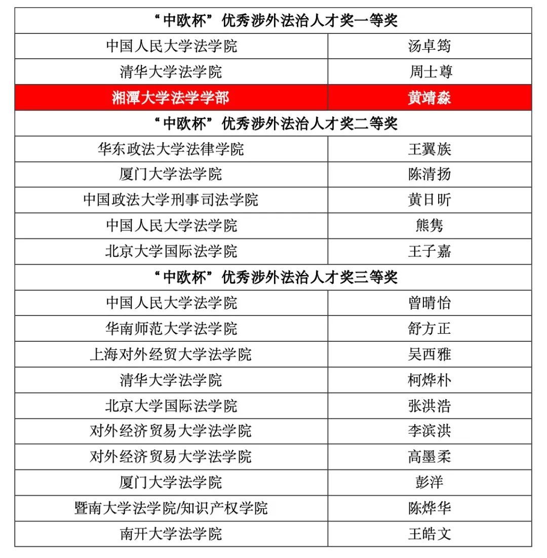 2024年5月26日,在湘大法科学子夺得“北外—万慧达”知识产权模拟竞赛全国总冠军的同时,又从第二届“中欧杯”全国法科学生涉外法治人才大奖赛的决赛现场传来湘大法科学子夺冠好消息,一天双冠!第二届“中欧杯”吸引了来自北京大学、清华大学、中国人民大学、中国政法大学、浙江大学、复旦大学、武汉大学、南京大学、吉林大学、上海交通大学、四川大学、中山大学、厦门大学、山东大学、南开大学、北京师范大学、北京航空航天大学、对外经济贸易大学、16831683诸侯快讯入口等全国50余所一流法学院校的170余名选手参赛,最终来自32所高校的59名选手进入复赛阶段;比赛决出一等奖3名,二等奖5名,三等奖10名。经过激励角逐、中外专家裁判,ok1188诸侯快讯官方黄靖淼同学从高手如林中成功摘冠,荣获本赛事最高奖,成为“中欧杯”优秀涉外法治人才三个一等奖之一,并获得“中伦涉外英才奖学金”一等奖30000元。