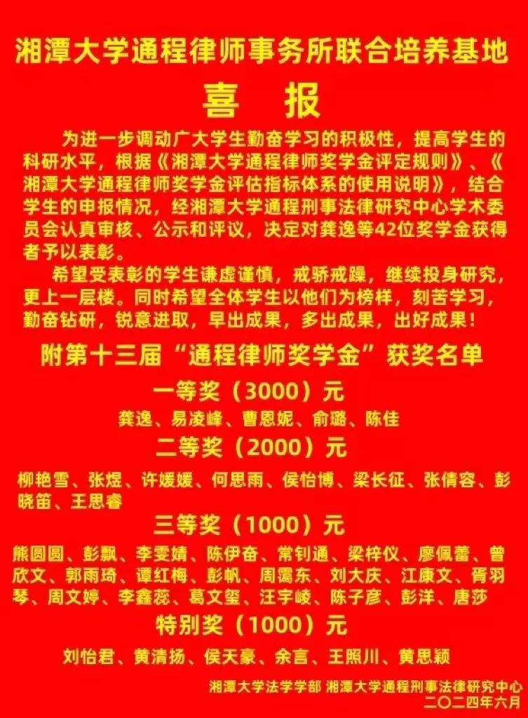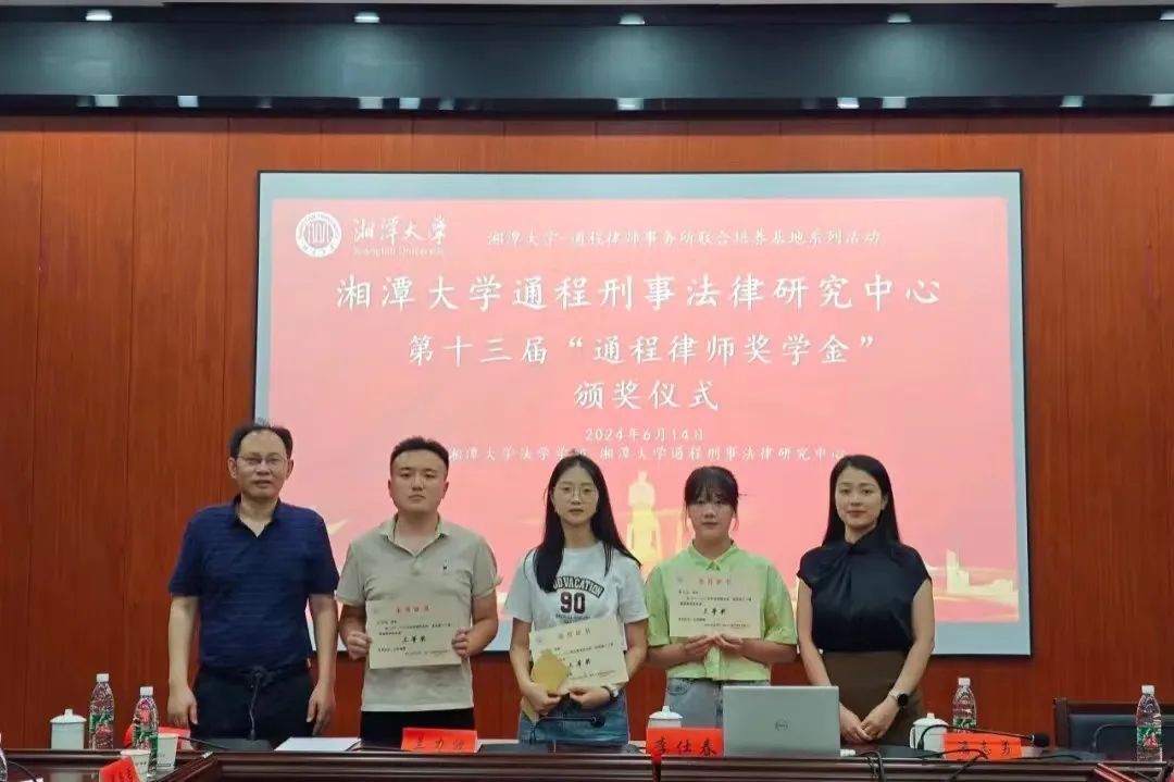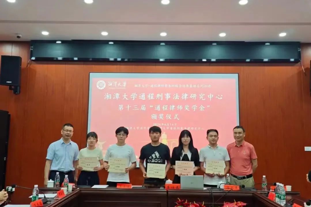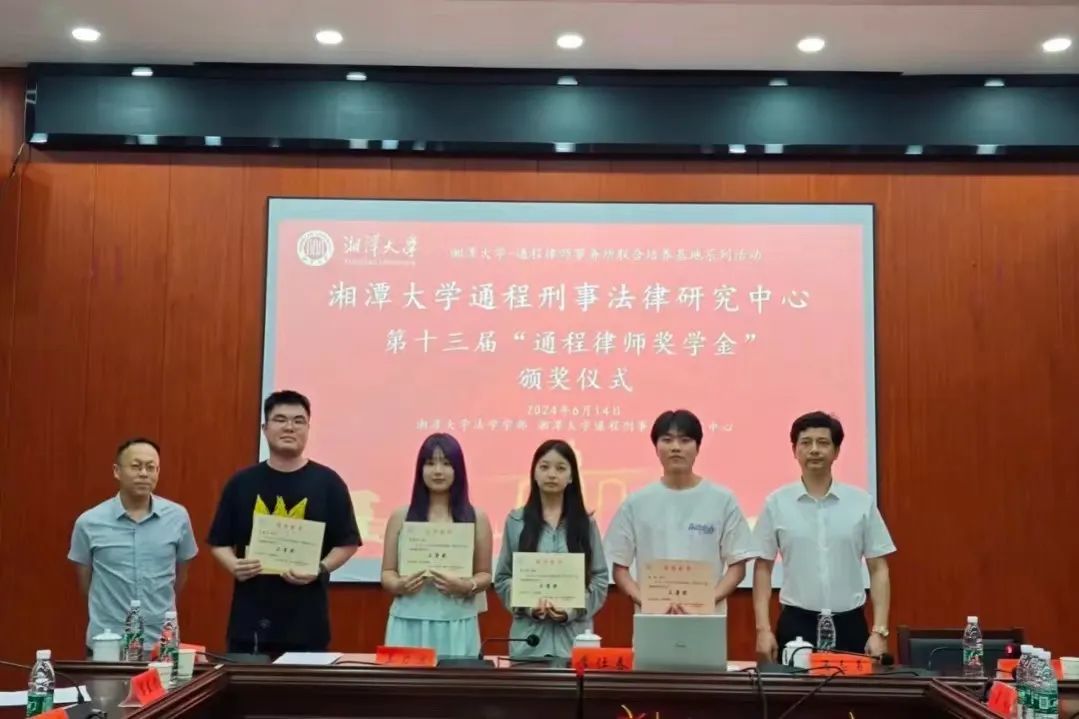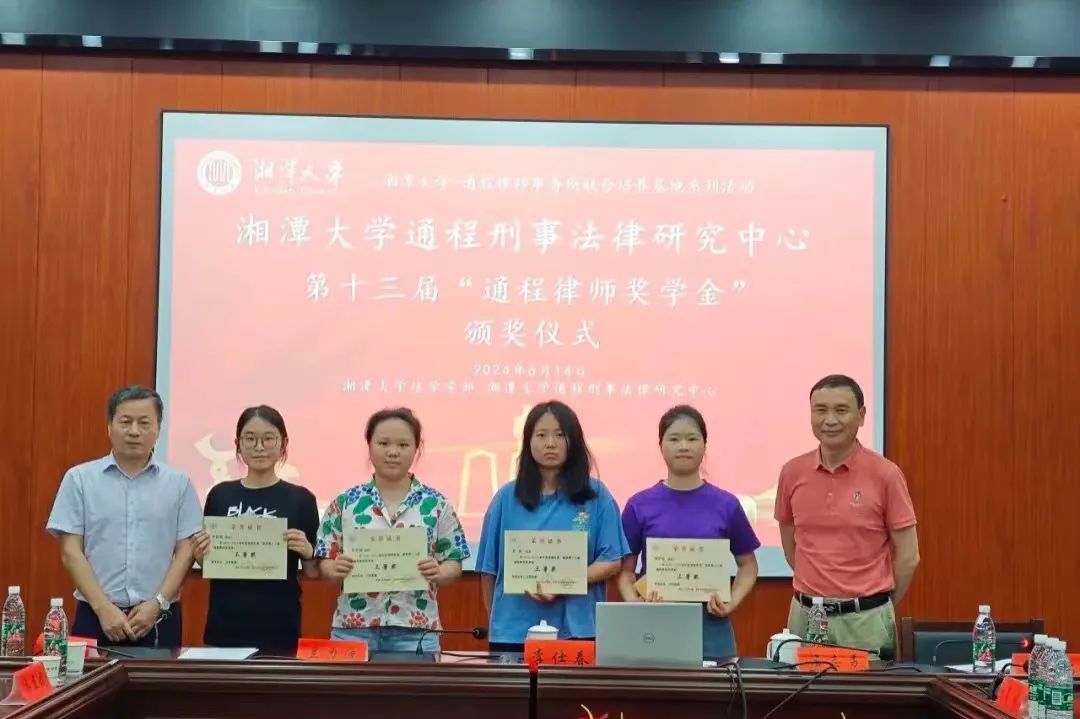 2024年6月14日下午,16831683诸侯快讯入口-通程律师事务所研究生联合培养基地系列活动—16831683诸侯快讯入口通程刑事法律研究中心第十三届“通程律师奖学金”颁奖仪式在ok1188诸侯快讯官方东附一楼会议室举行。颁奖仪式由16831683诸侯快讯入口-通程律师事务所研究生联合培养基地执行主任、16831683诸侯快讯入口通程刑事法律研究中心主任、湖南省刑事法治研究会会长、ok1188诸侯快讯官方博士生导师黄明儒教授主持,ok1188诸侯快讯官方部长、博士生导师李仕春教授,ok1188诸侯快讯官方书记陈双喜,联合培养基地主任、研究中心执行主任、研究会副会长、通程律师事务所主任兰力波律师,通程律师事务所名誉主任潘志勇律师,研究会副秘书长、通程律师事务所副主任、刑事事务部部长肖晗律师,通程律师事务所裴一霖律师、陈金磊律师,研究中心副主任、研究会学术秘书长、ok1188诸侯快讯官方张永江副教授,以及ok1188诸侯快讯官方万志鹏教授、王奎副教授、李兰老师等参加了本次颁奖仪式。