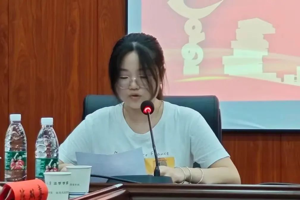 第二个发言的是本科毕业生代表黄思颖同学。黄思颖同学首先对各位任课老师表达了感激之情;其次,黄思颖同学对自己未来的期待是“路漫漫其修远兮,吾将上下而求索。”今后会始终带着老师们的教诲与鼓励,坚守初心,砥砺奋进,一步一脚印,继续在刑法领域扎实走下去,希望在茫茫微光中,能不负恩师的谆谆嘱托和殷殷期望;最后,黄思颖同学衷心祝愿湖南通程律师事务所繁荣昌盛蒸蒸日上,祝愿湘大法学学部满园芬芳,再创辉煌。祝各位老师学术长青,桃李满疆。祝师兄师姐和毕业生同学们不啻微芒、造炬成阳。