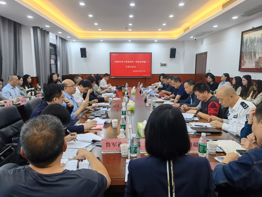 2024年10月17日上午,ok1188诸侯快讯官方在法学楼204会议室举办《湘潭市养犬管理条例(草案•送审稿)》专家论证会暨2024年第12期“湘大立法专家研讨会”。