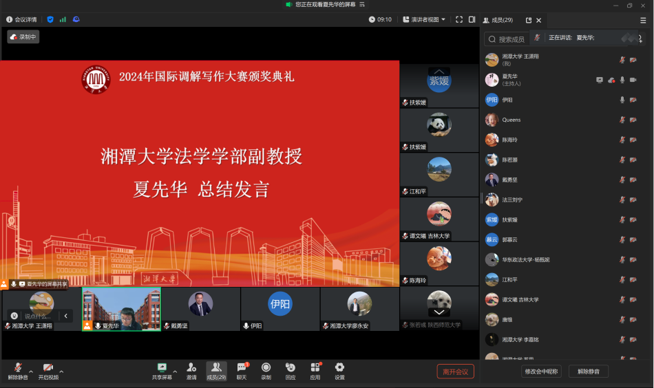 最后,由夏先华副教授进行总结发言。夏老师指出,几位获奖代表向大家倾心分享了各自的撰写经验和技巧,展示了如何完成一份优秀的调解备忘录。期待所有参赛同学在下一届大赛中再创佳绩,并对各位评委和专家的辛勤付出表示了诚挚感谢。
