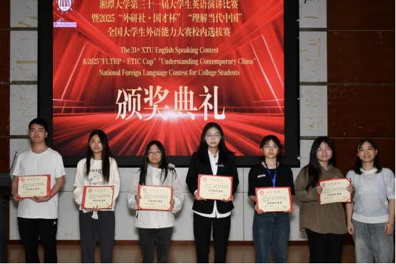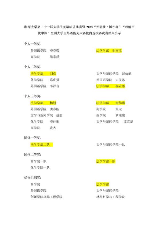本次决赛中,法学学部派出两支队伍参赛,由五名2024级同学组成。他们在赛场上沉着自信,以扎实的英语功底、默契的团队协作和出色的临场表现,赢得了评委与观众的高度认可。面对激烈竞争,他们从容应对,凭借流畅的表达、严谨的逻辑、独到的见解结合专业的法学知识,深入阐释对“理解当代中国”这一主题的认识与思考,充分展现了法学学子的专业素养与思辨能力。最终,法学七班谢雨欣凭借优异表现斩获个人一等奖;法学卓越班刘彦、法学七班杨若愚荣获二等奖,信风一班杨翘、法学卓越班谢韵琳获得三等奖。