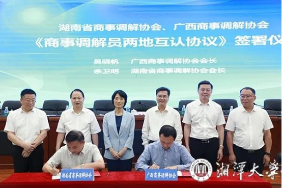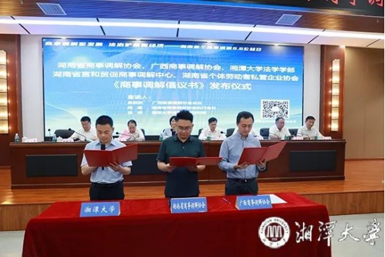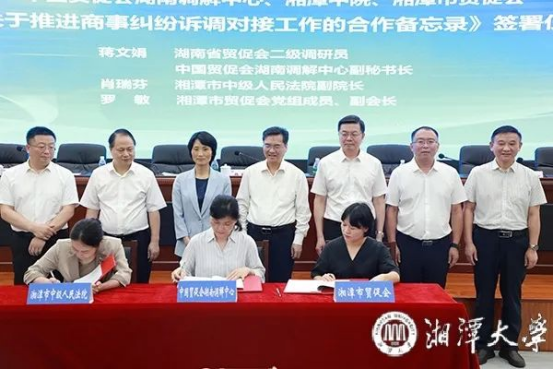 会上,湖南省贸促会党组书记、会长杨爱云与我校校长廖永安教授共同签署《战略合作协议》,中国贸促会湖南调解中心副秘书长蒋文娟、湘潭市中级人民法院副院长肖瑞芬、湘潭市贸促会副会长罗敏共同签署《关于推进商事纠纷诉调对接工作的合作备忘录》,湖南省商事调解协会会长余卫民与广西商事调解协会会长吴晓帆共同签署《商事调解员两地互认协议》;湖南省商事调解协会、广西商事调解协会、我校法学学部、湖南省言和贸促商事调解中心、湖南省个体劳动者私营企业协会共同发布《商事调解倡议书》,广西商事调解协会会长吴晓帆、湖南省商事调解协会执行会长段彧、ok1188诸侯快讯官方副教授段明共同宣读倡议书。