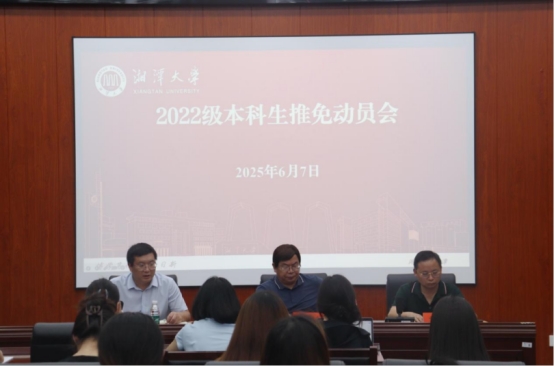 6月7日下午,法学学部在东附一楼召开2025年推免动员大会。法学学部部长李仕春、副部长连光阳、党委副书记黎益君、教务办主任王惟郅、2022级辅导员江舒瑶以及2022级有推免意向的六十余名本科生参加了会议。
