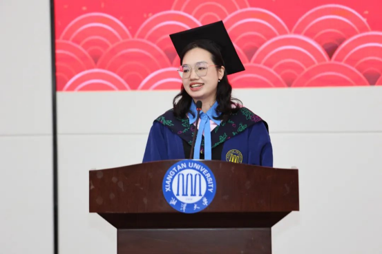 我是法学学部2022级硕士研究生薛亚琼。非常荣幸能有机会站在这里和大家共享这个庄严而充满希望的时刻。首先,请允许我代表2025届全体硕士毕业生向母校、学部、师长和一路陪伴我们的家人朋友们致以最真挚的感谢。