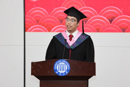 湘大的校友说:湘大的学生就像洞庭湖边的杨柳,倒插着也能成长,洞庭湖的麻雀,飞到湘大,也就成了凤凰。巧合的是,我的家乡就在洞庭湖畔,我绝不敢说自己已经成了凤凰,但是不可否认的是,湘大给我们插上了梦想腾飞的翅膀。今天,我们就要告别湘大,我想起115年前,同样是一位青年,同样是离开湘潭,毛泽东给父亲留下一首诗,诗中写到:“埋骨何须桑梓地,人生无处不青山。”当新时代的接力棒交到我们手中时,青山已不是地理意义上的存在。它是“养浩然正气,铸法治精魂”的赤子情怀,是刻印在我们骨子里的程序正义与实体正义,更是我们即将奔赴的远方。只要是需要我们的地方,都是可以扎根的“青山”。