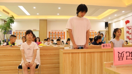 在严谨的模拟庭审环节,“法护童心,筑梦七彩”团队大学生志愿者完整呈现"林轩宇涉嫌帮助信息网络犯罪活动罪"的司法流程。公诉人谢韵琳、周永富通过银行流水、聊天记录等完整证据链,揭示被告人骗取亲友8张银行卡进行非法资金结算的犯罪事实;辩护人楚明熹则剖析犯罪团伙精心设计的双重骗局——以学长身份接触、化身网友诱导,强调刚成年学生缺乏主观明知的关键点;被告人胡怀理当庭忏悔"社会阅历不足不是犯罪借口"的陈述更引发深思。活动特别邀请四位社区儿童担任审判员、法警,当他们或端坐审判台,或押解"被告人"入庭,严肃神色与稚嫩身形的反差,成为司法威严最生动的注脚。主持人在休庭环节抛出"该不该判刑"的核心之问,现场讨论气氛热烈:"他帮坏人转黑钱就是犯罪!""可他是被坏人骗着干的!"童言稚语间碰撞出对法律主客观要件的初阶思辨。