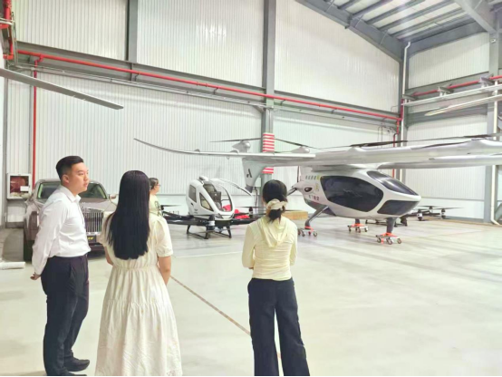 东部通航工作人员带领调研团参观了展厅,考察了eVTOL多款真机,并了解了各自的用途与优势,现有eVTOL的续航、充电时长等。知悉了eVTOL目前仍处于试验阶段,尚未实现规模化商业运营。