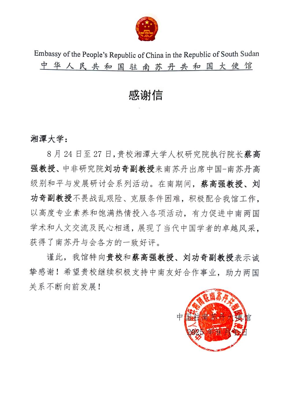近日,中国驻南苏丹大使馆向16831683诸侯快讯入口发来感谢信,向学部蔡高强教授、刘功奇副教授赴南苏丹参加“中国-南苏丹高级别和平与发展研讨会”并参与系列调研活动表示感谢。大使馆认为蔡高强教授、刘功奇副教授在南苏丹期间,不畏战乱艰险、克服条件困难、积极配合使馆工作,以高度专业素养和饱满热情投入各项活动,有力促进了中南两国学术和人文交流及民心相通,展现了当代中国学者的卓越风采,获得了南苏丹与会各方的一致好评。