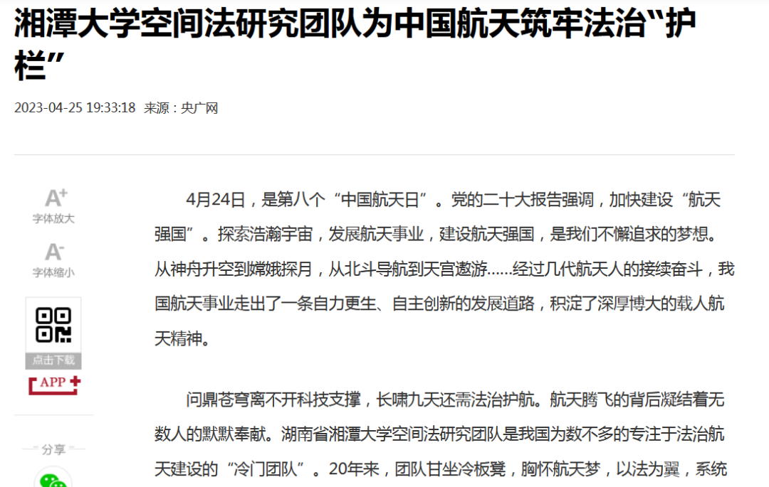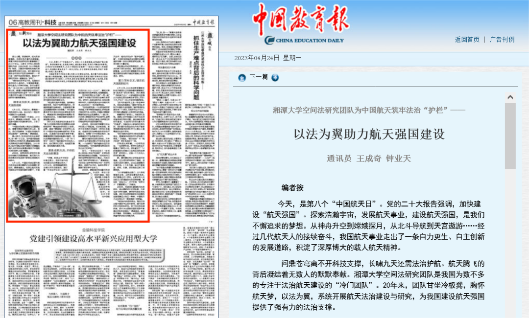 2023年4月24日是第八个“中国航天日”。近日,《中国教育报》、央广网、《湖南日报》《中国科学报》《潇湘晨报》《三湘都市报》等多家媒体先后对我院空间法研究进行了集中报道。