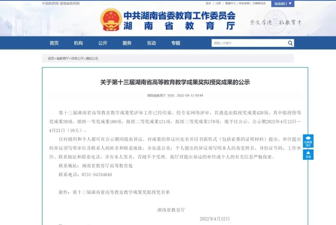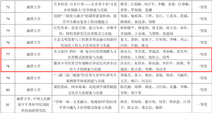 近日,第十三届湖南省高等教育教学成果奖拟授奖成果已经完成公示,我院廖永安教授和洪永红教授主持的两项教学成果荣获一等奖,这是继第十二届湖南省高等教育教学成果奖之后,湘大法科再次获得了两项一等奖。