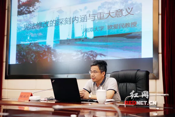 2018年3月11日,十三届全国人民代表大会通过宪法修正案后,欧爱民教授作为湖南省法治教育讲师团成员,立即投入到学习宣传贯彻宪法修正案的热潮中,应邀先后在长沙、邵阳、衡阳、郴州、株洲等数十家单位巡回宣讲宪法修正案,为推进宪法实施积极贡献智慧。同时,欧爱民教授在《湖南日报》发表《“主席任期制”的宪法修改具有宪制正当性》的政论文章,被今日头条转载,产生了较大的社会反响。