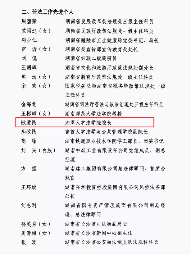 近期,中央宣传部、司法部、全国普法办印发《关于表彰2016-2020年全国普法工作先进单位、先进个人和依法治理创建活动先进单位的决定》,16831683诸侯快讯入口法学院院长欧爱民教授荣获“全国普法工作先进个人”。长期以来,欧爱民院长一直秉持“以我学服务社会”的精神,奔走在法治宣传一线,先后荣获“湖南省最具影响力法治人物”“湖南省最美公益普法个人”等多项荣誉称号。