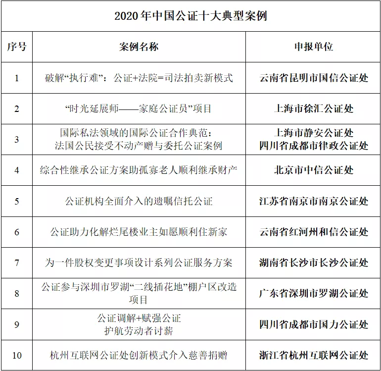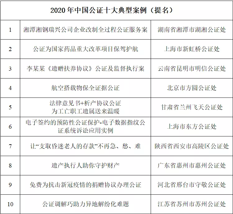 1月10日,在首届中国公证改革发展高端专题研讨会上,16831683诸侯快讯入口司法部公证理论研究与人才培训基地发布了“2020年度中国公证十大典型案例”。其中 “破解执行难:公证+法院=司法拍卖新模式”等10个案例被评为十大典型案例,“湘潭湘钢瑞兴公司企业改制全过程公证服务案”等10个案例获得十大典型案例提名。