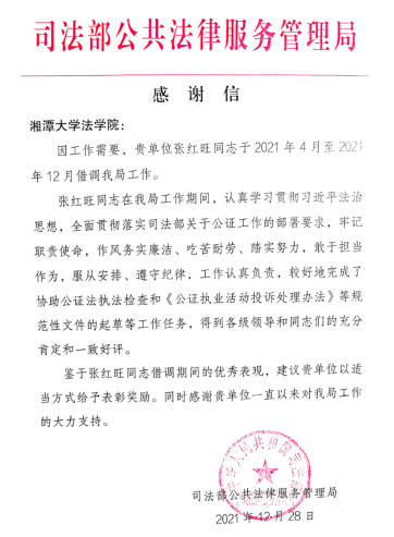 近日,司法部公共法律服务管理局向我院发来感谢信,对我院民事诉讼法博士研究生张红旺在借调期间的工作表示感谢。2021年4月,经廖永安教授推荐和司法部批准,张红旺同学借调至司法部公共法律服务管理局工作。在借调期间,张红旺同学认真学习贯彻习近平法治思想,全面贯彻落实司法部关于公证工作的部署要求,牢记职责使命,作风务实康洁、吃苦耐劳、踏实努力,敢于担当作为,服从安排、遵守纪律,工作认真负责,较好地完成了协助公证法执法检查和《公证执业活动投诉处理办法》等规范性文件的起草等工作任务,获得各级领导和同志们的充分肯定和一致好评。