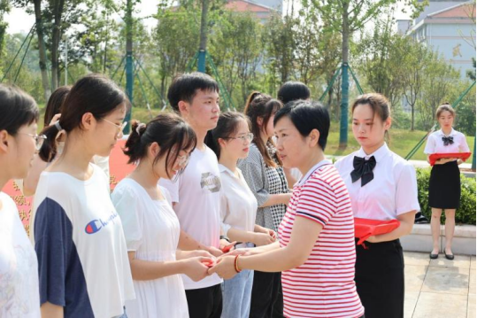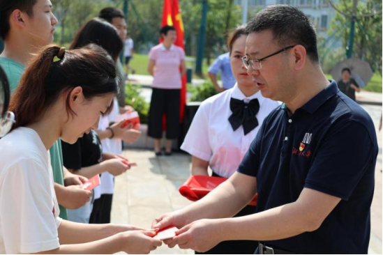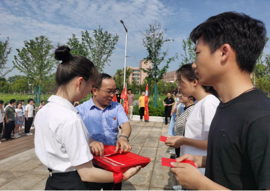 随后,法学院党委陈双喜书记、知识产权学院直属党支部书记田良富、信用风险管理学院直属党支部书记易立峰为新党员颁发了党徽和党员证,鲜红的党旗与金色的党徽交相辉映,在阳光下散发出耀眼的光芒。