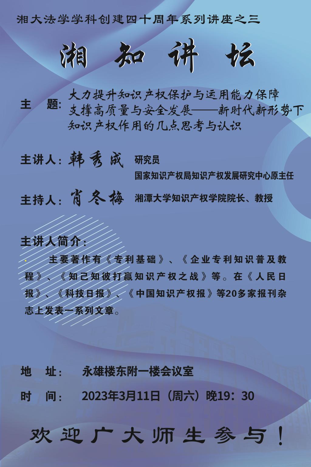【湘大法学学科创建四十周年系列讲座之三】韩秀成:大力提升知识产权保护与运用能力保障支撑高质量与安全发展——新时代新形势下知识产权作用的几点思考与认识