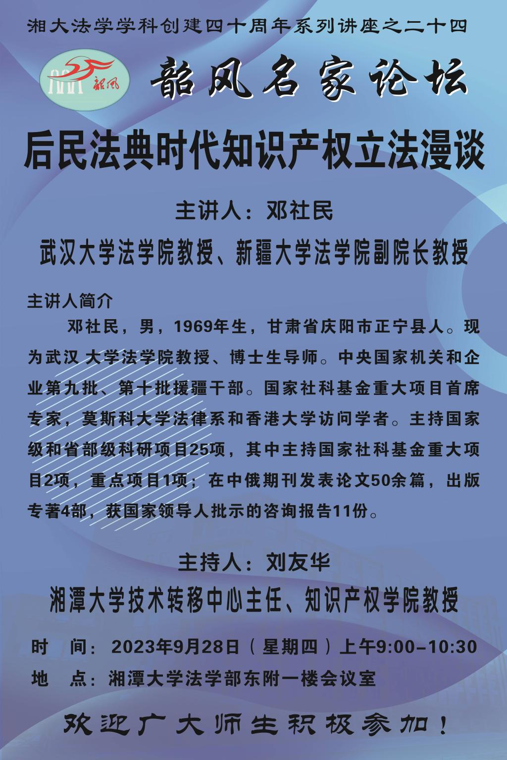 【湘大法学学科创建四十周年系列讲座之二十四】邓社民:后民法典时代知识产权立法漫谈