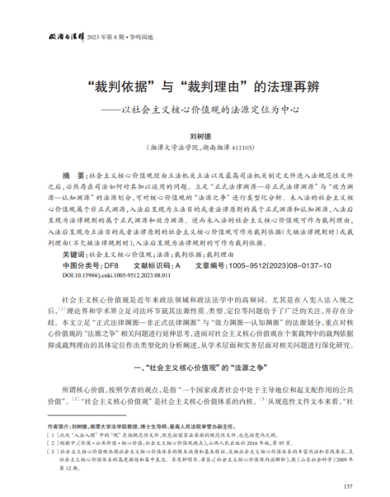 “裁判依据”与“裁判理由”的法理再辨——以社会主义核心价值观的法源定位为中心》刊发于