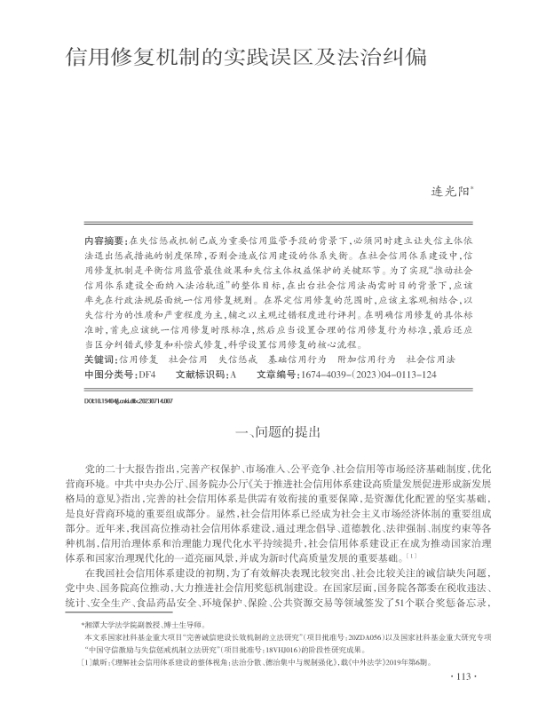 我院连光阳副教授的论文《信用修复机制的实践误区及法治纠偏》刊发于