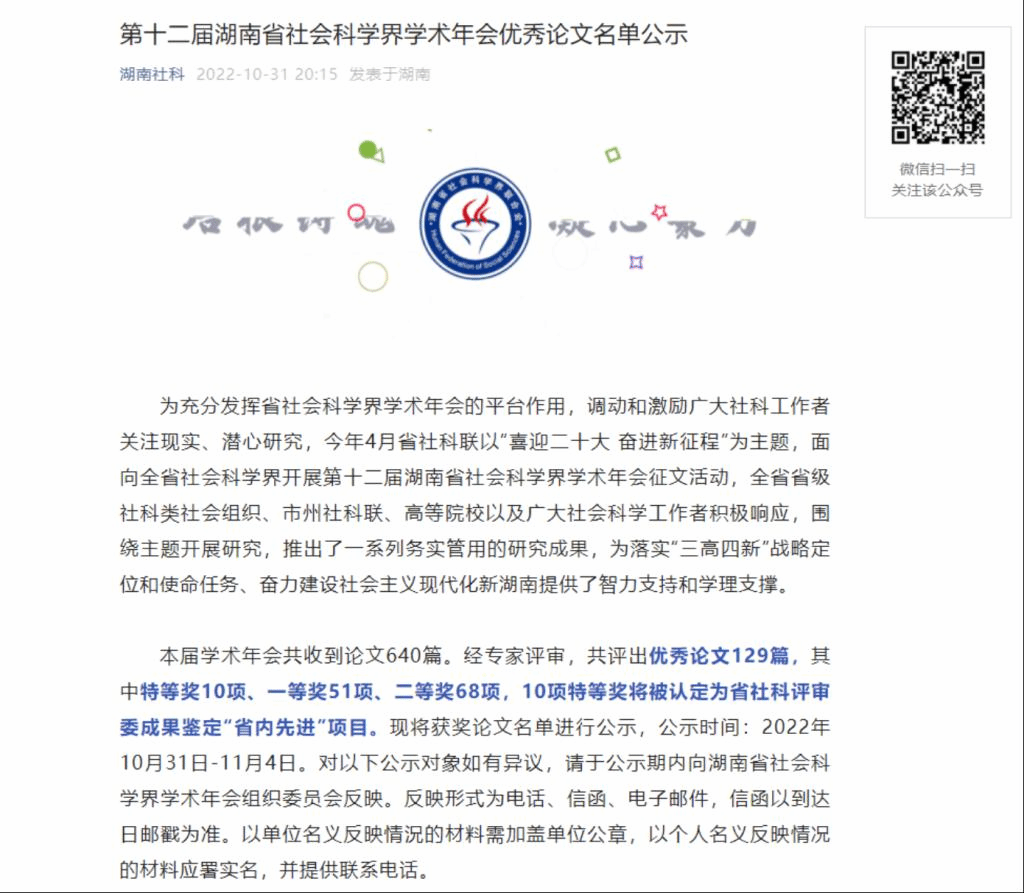 第十二届湖南省社会科学界学术年会优秀论文名单于10月31日公示,我院吕晓刚老师和夏先华老师分获优秀论文一、二等奖。本届学术年会共收到论文640篇,经专家评审,共评出优秀论文129篇,其中特等奖10项、一等奖51项、二等奖68项。