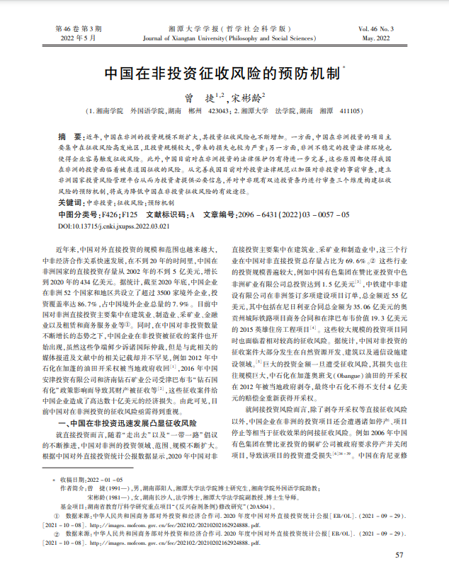 我院博士生曾捷和宋彬龄副教授合著论文《中国在非投资征收风险的预防机制》刊发于