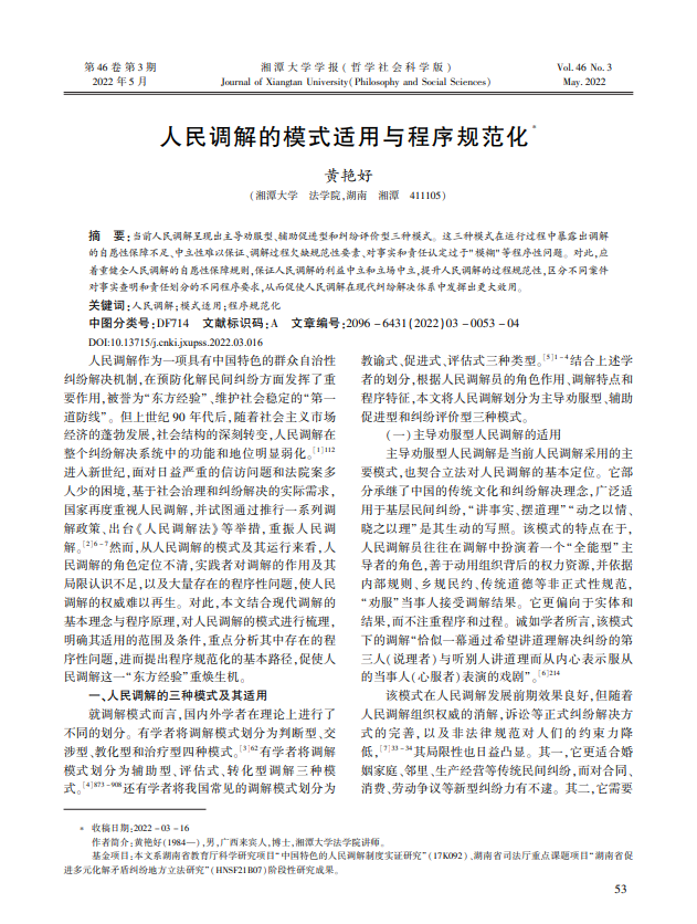 我院黄艳好老师的论文《人民调解的模式适用与程序规范化》刊发于