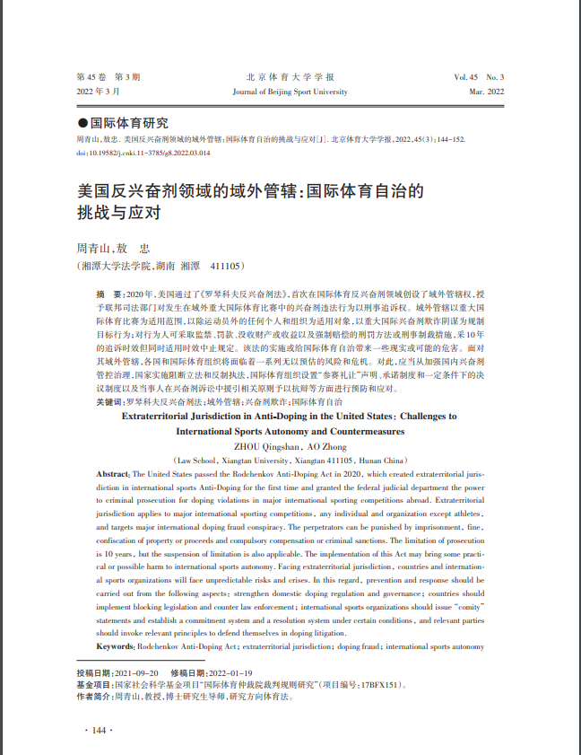 我院周青山教授和博士生敖忠合著论文《美国反兴奋剂领域的域外管辖:国际体育自治的挑战与应对》刊发于