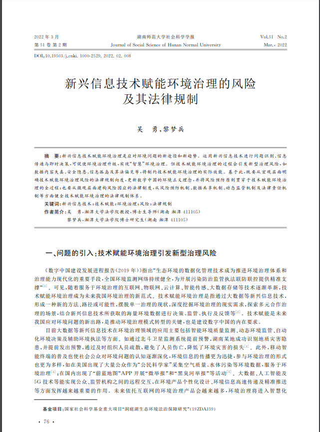 我院吴勇教授和研究生黎梦兵合著论文《新兴信息技术赋能环境治理的风险及其法律规制》刊发于