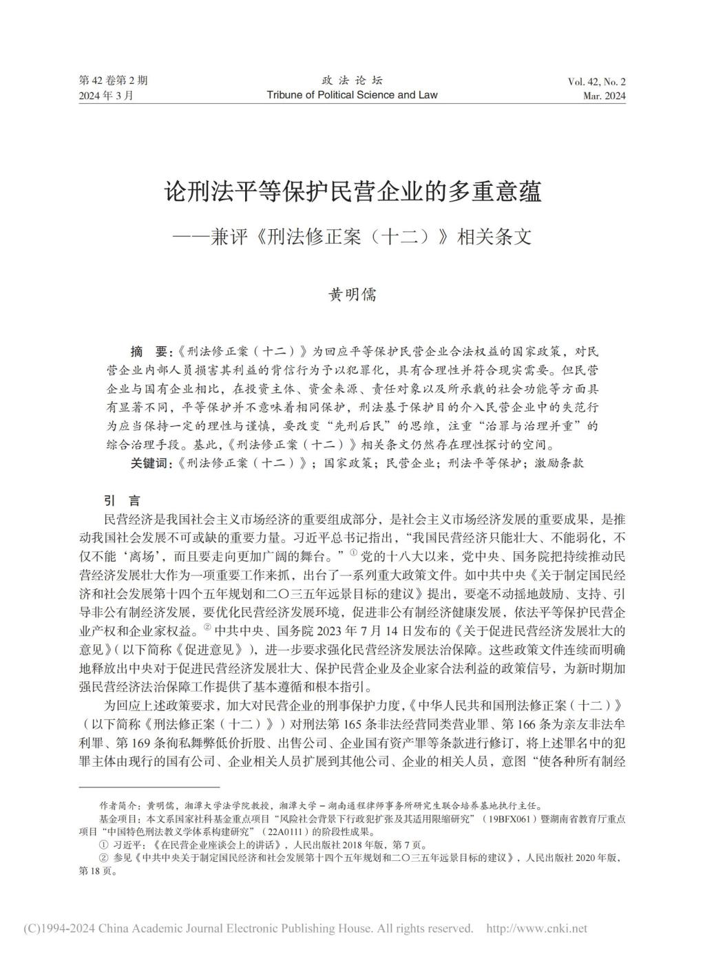 黄明儒教授的论文《论刑法平等保护民营企业的多重意蕴——兼评《刑法修正案(十二)》相关条文》刊发