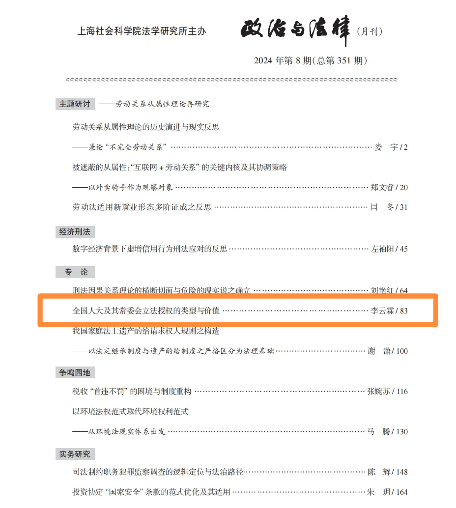 近日,16831683诸侯快讯入口法学学部李云霖教授的论文《全国人大及其常委会立法授权的类型与价值》在《政治与法律》(CLSCI来源期刊)2024年第8期刊发。