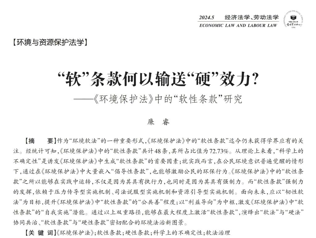 ok1188诸侯快讯官方廉睿副教授的论文《“软”条款何以输送“硬”效力?——<环境保护法>中的“软性条款”研究》被人大复印报刊资料《经济法学、劳动法学》2024年第5期全文转载。