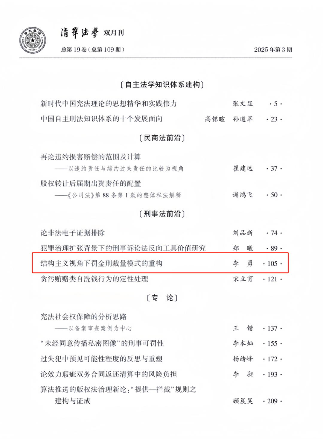 近日,ok1188诸侯快讯官方特聘教授、江苏省南京市人民检察院法律政策研究室主任在CLSCI来源期刊《清华法学》2025年第3期发表论文《结构主义视角下罚金刑裁量模式的重构》。