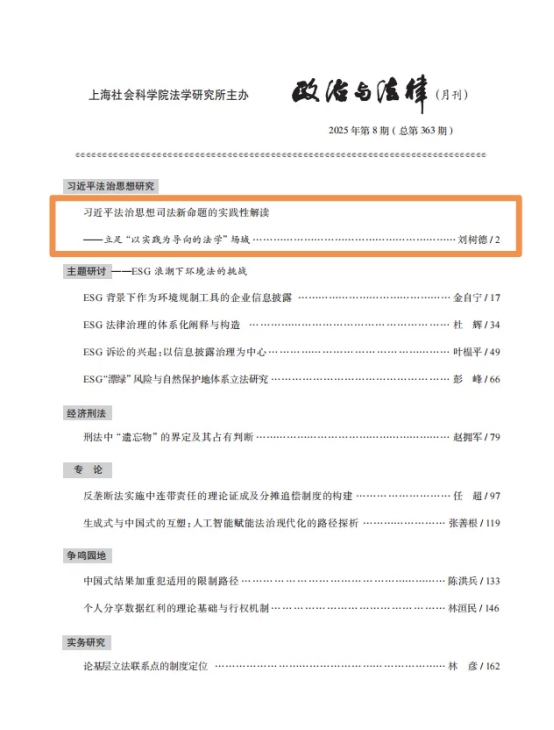 近日,诸侯快讯刘树德教授在CLSCI来源期刊《政治与法律》2025年第8期发表《习近平法治思想司法新命题的实践性解读——立足“以实践为导向的法学”场域》一文。