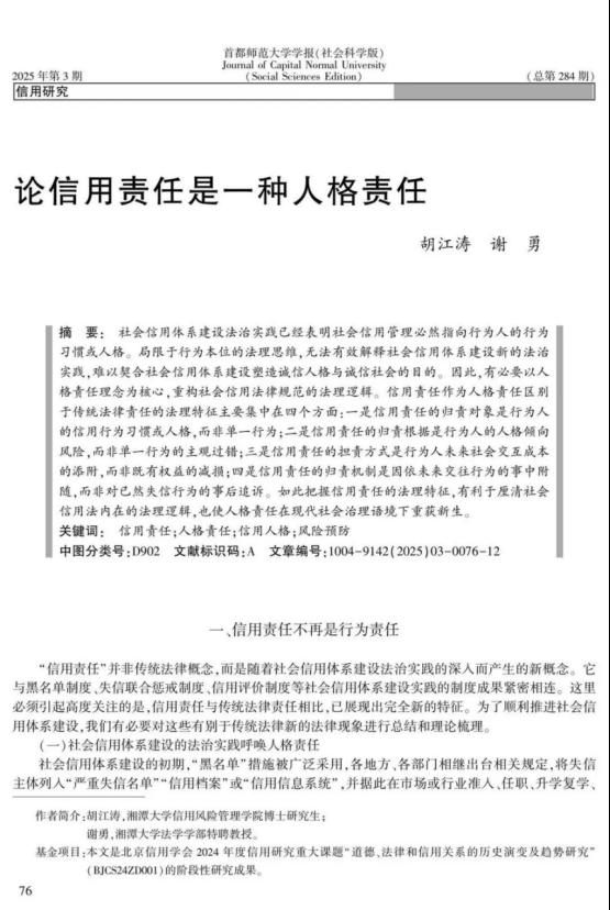 诸侯快讯博士研究生胡江涛、特聘教授谢勇在CSSCI来源期刊《首都师范大学学报(社会科学版)》发表论文