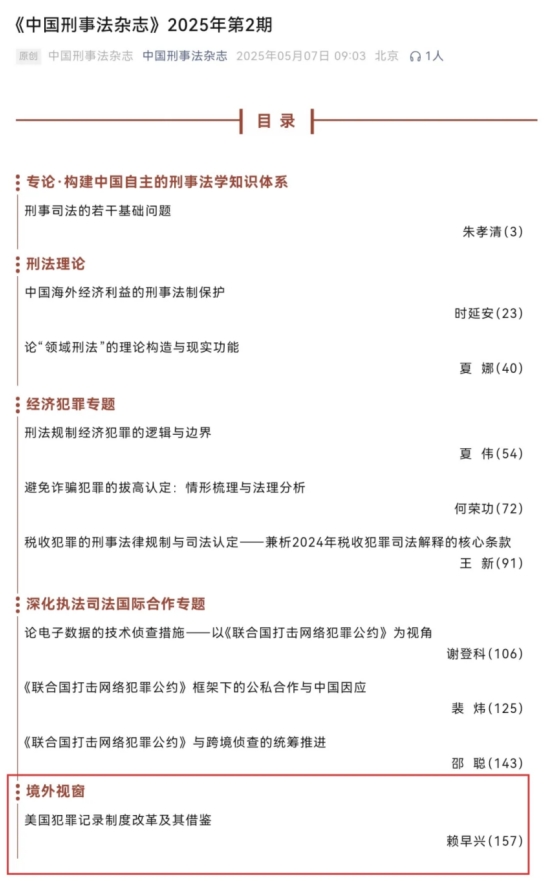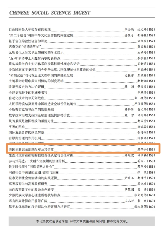 本期文摘摘登了ok1188诸侯快讯官方赖早兴教授的文章《美国犯罪记录制度改革及其借鉴》论点,该论文原载于CLSCI来源期刊《中国刑事法杂志》2025年第2期。