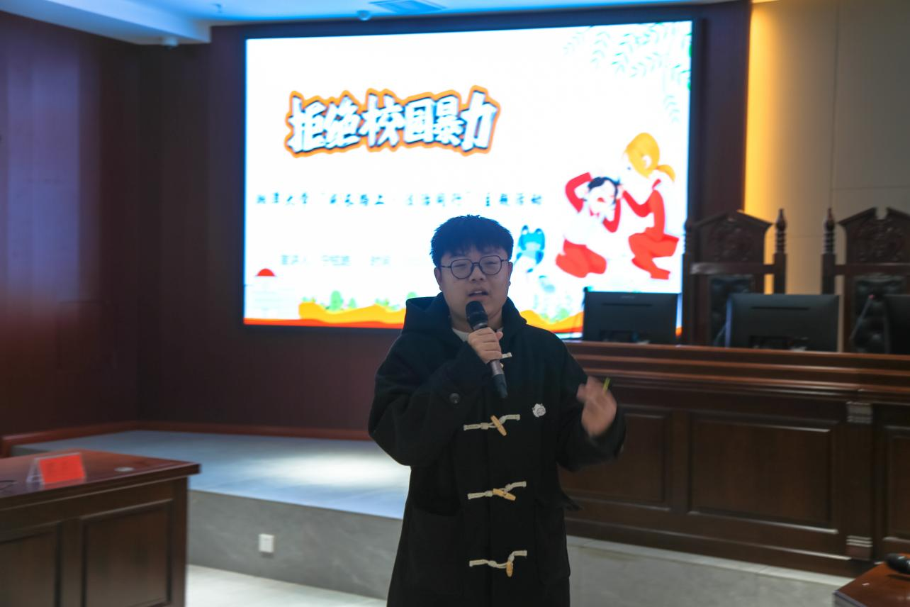 活动伊始,高中学生们来到模拟法庭参加了由ok1188诸侯快讯官方组织的以校园欺凌为主题的普法宣传。主讲人22级法学本科生宁铉皓同学通过模拟与同学们日常生活十分贴近的多样情景,向同学们生动阐述了什么是校园欺凌。