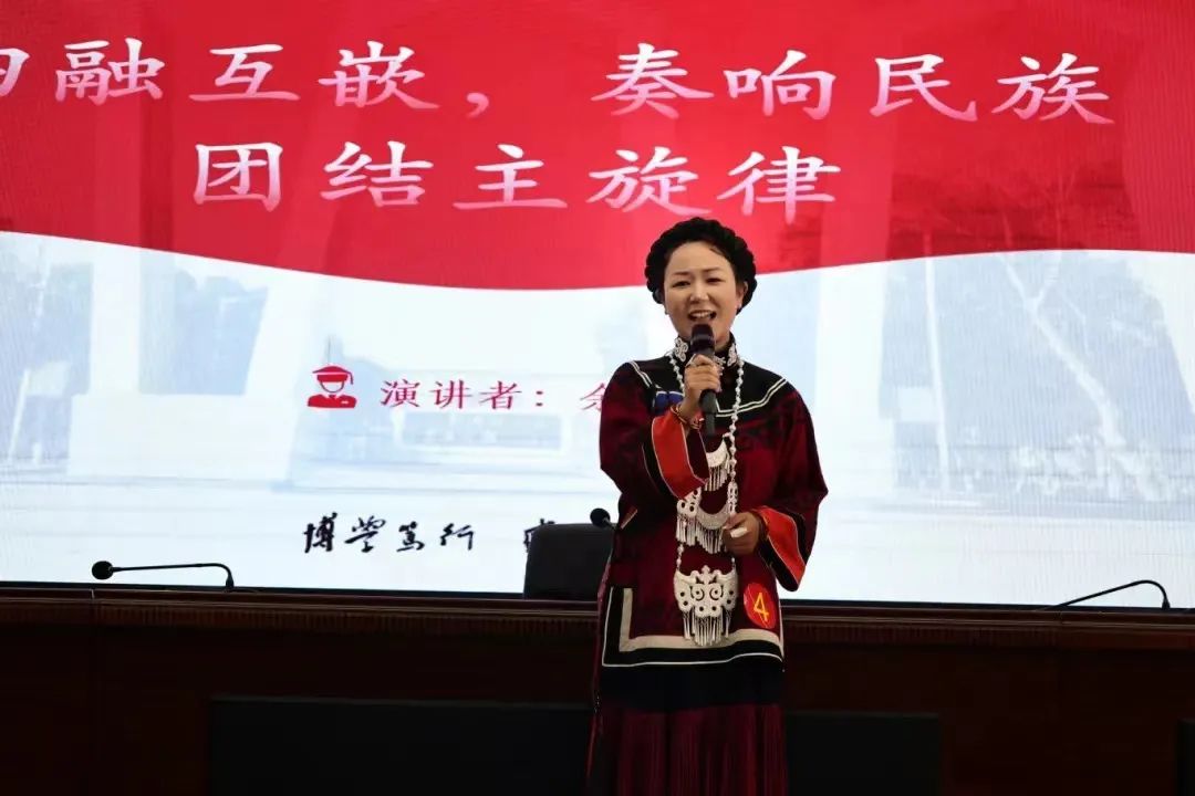 余楠同学从融赤子之心、融家国之情、融民族之力、融共生之和四个方面,讲述家乡故事,赞扬四融互嵌拓出民族团结进步的新气象,在平凡中探寻民族团结精神闪耀的光辉时刻。