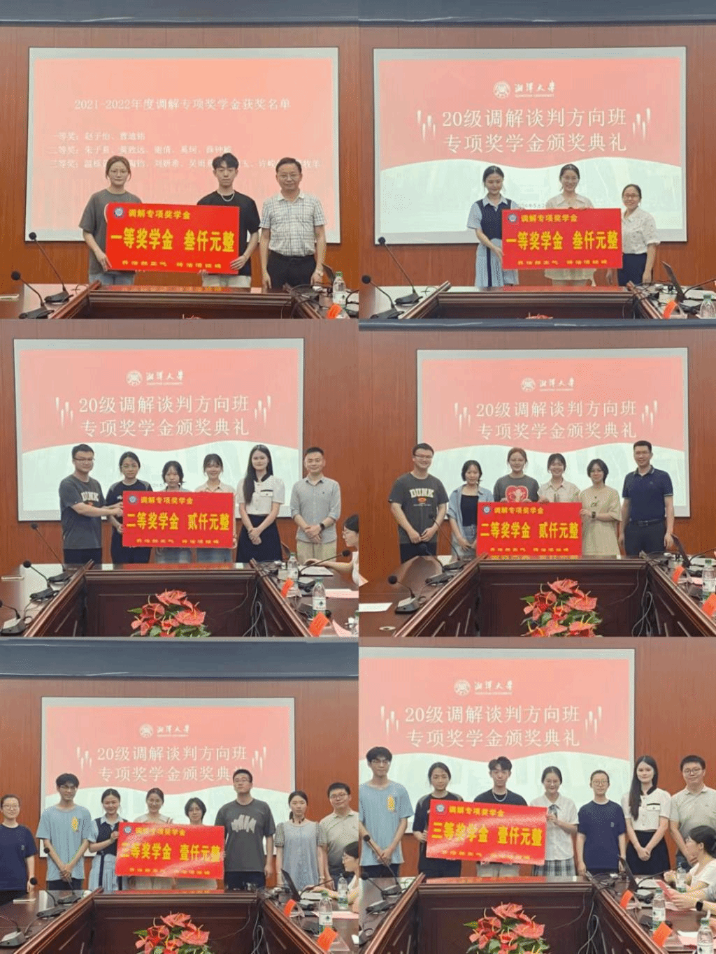 随后,黎益君副书记、段明老师、夏先华老师分别为2021-2022年度调解专项奖学金一、二、三等奖获奖同学进行颁奖;李喜莲老师、黄艳好老师、夏先华老师分别为2022-2023年度调解专项奖学金一、二、三等奖获奖同学进行颁奖。