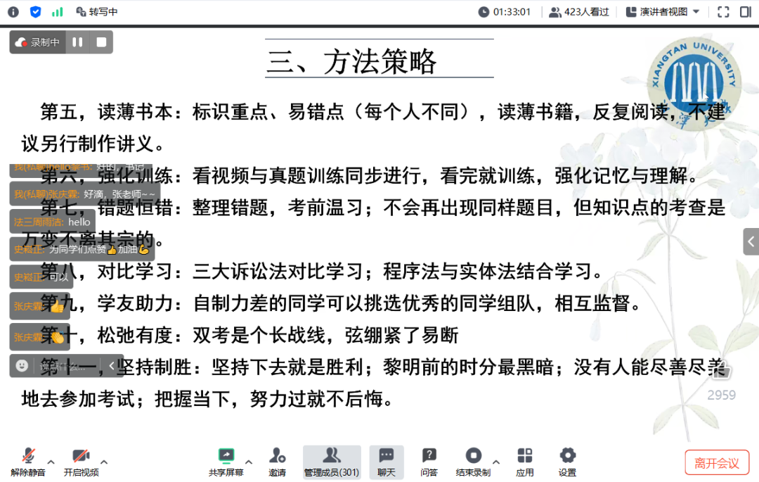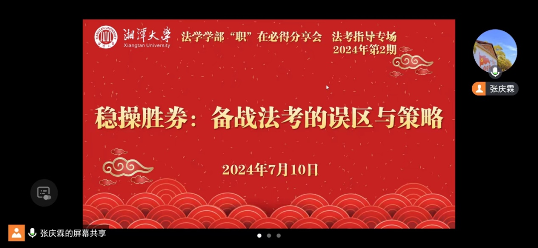 本次会议邀请了张庆霖博士、夏先华博士、谭达宗副教授等三位专业老师为同学们进行法考指导,邀请了贾盛卉、李峥、任晓仙等三位一次性高分通过法考的研究生、本科生代表做备考经验分享。活动由张庆霖博士、21级年级辅导员江冰洁老师主持。
