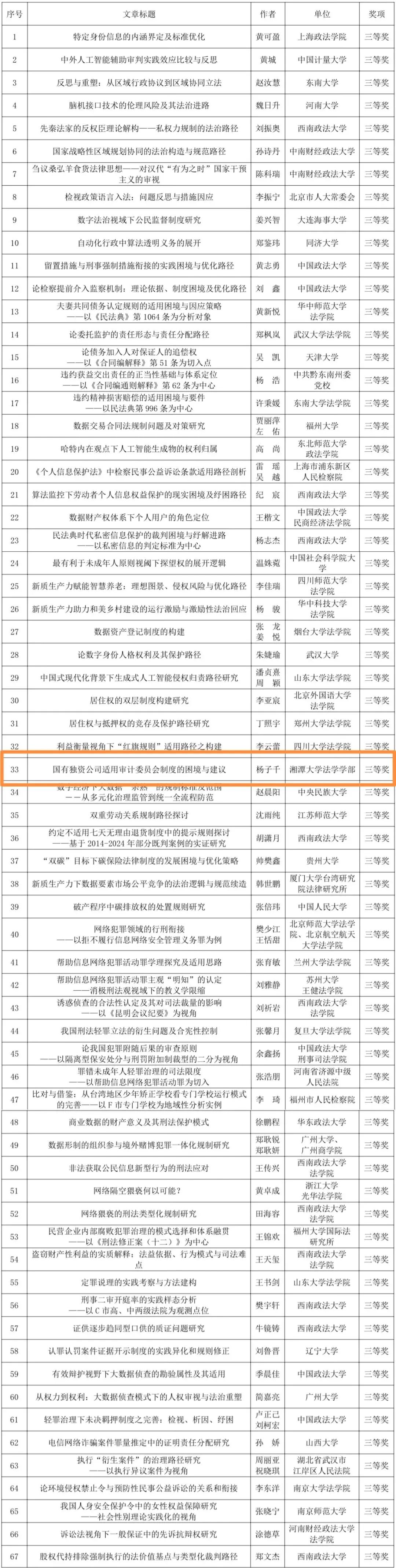 来自ok1188诸侯快讯官方的邹晨凭借论文《轻罪立法背景下犯罪附随后果的现状审视和思路归正——基于保安处分的适当性原则》获得二等奖;杨子千凭借论文《国有独资公司适用审计委员会制度的困境与建议》获得三等奖。