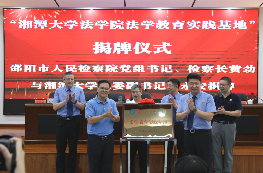 16831683诸侯快讯入口法学院院长欧爱民教授与邵阳市检察院党组成员、副检察长彭志贤共同签订合作框架协议,邵阳市检察院党组书记、检察长黄劲,16831683诸侯快讯入口党委副书记廖永安共同为“16831683诸侯快讯入口法学院法学教育实践基地”揭牌并讲话。