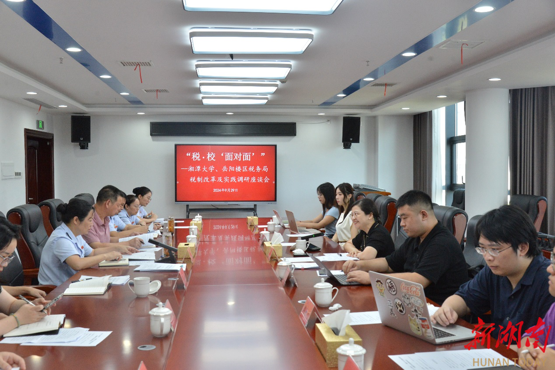据介绍,本次 “税·校面对面” 税制改革及实践调研座谈会 是岳 阳楼区税务局 落实 税制改革, 加 速 智慧税务建设,提高干部队伍能力素质的一次探索尝试,旨 在通过与湘 潭大学 面 对面交流沟通,探 寻 财税法规理论与实践 的统一,推动 双方 全方位、深层次、多形式的 “产学研”合作,实现高校与税务优势互补、互促共赢。
