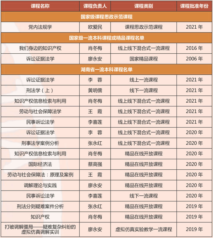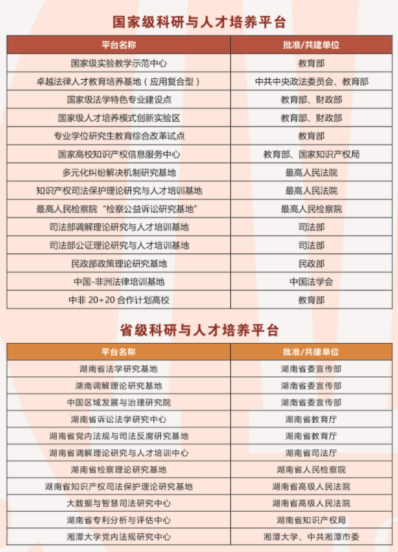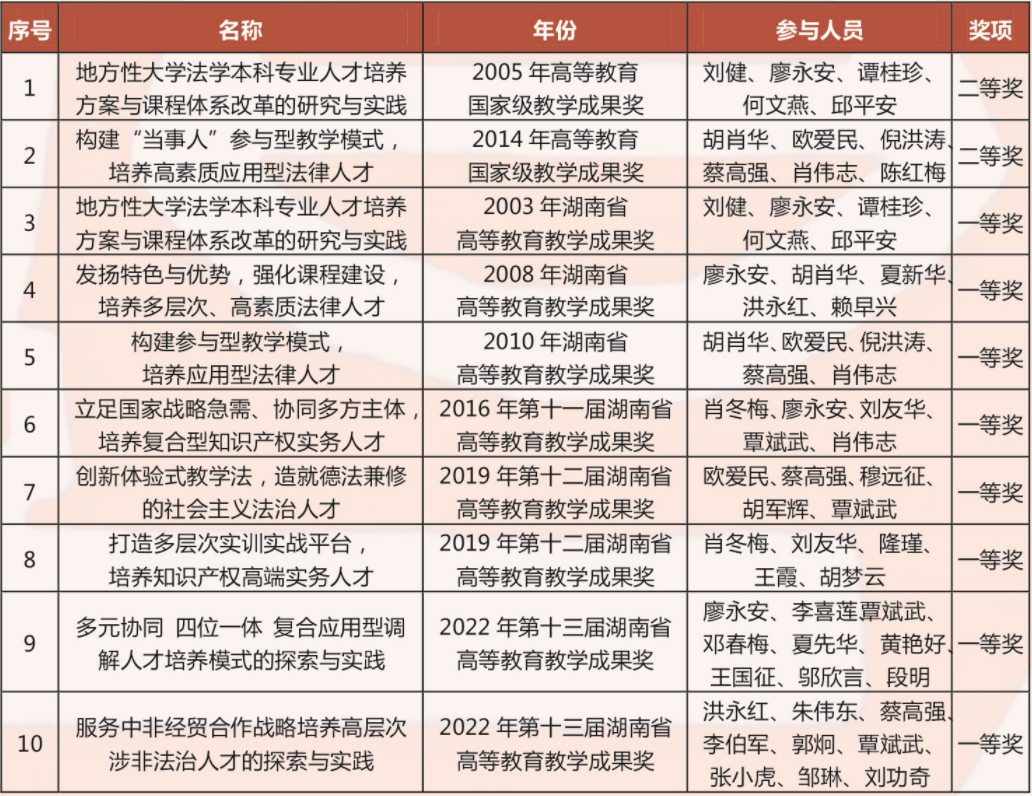 2012年获批国家首批卓越法律人才教育培养基地,是湖南省唯一的国家级法学专业综合改革试点单位和全国法律专业硕士学位研究生教育综合改革试点单位、国家级法学人才培养模式创新实验区、法学类国家级实验教学示范中心。2013年牵头成立的“法治湖南建设与区域社会治理协同创新中心”确认为湖南省2011协同创新中心(法学唯一)。
