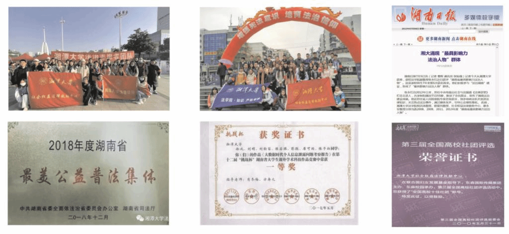 推出“公益维权四部曲”:法科师生依法“叫板”→媒体密集跟进报道→政府“接招”纠正→问题得以解决。有效推动 “长沙大桥收费”“院校歧视”“驾考合一”“教师招考身高歧视”等问题的解决。五年来,法律援助中心、法律诊所等学生社团共提供法律援助公益服务2000余次。学院师生先后5次被评为湖南省最具影响力的法治人物,形成享誉国内的湘大现象。