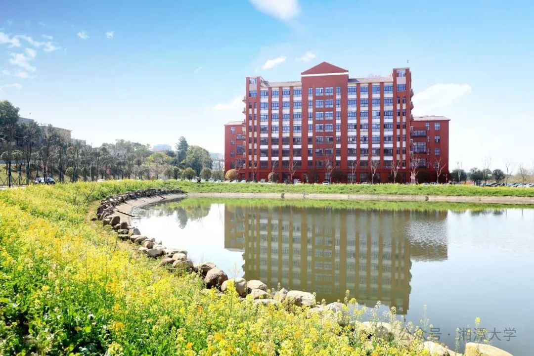 4月的湘大校园,花香满园。校园西侧,红色法学楼倒映在西湖水中,静静地俯瞰着湘大法科学子追光逐梦……