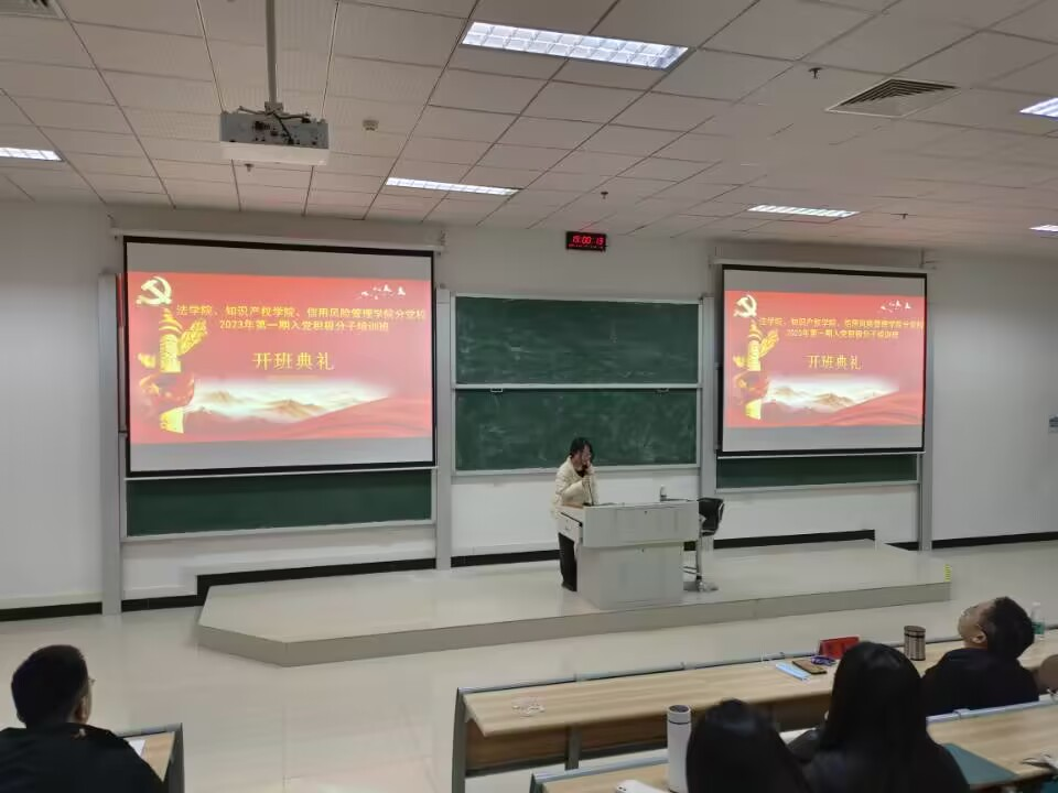 2023年3月21日晚上,法学院、知识产权学院、信用风险管理学院分党校在研究生院四阶梯教室举行了2023年第1期入党积极分子培训班开班典礼暨第一次专题讲座。法学院党委副书记黎益君、分党校培训班班主任黄彬出席开班典礼。248名入党积极分子参加了此次培训。
